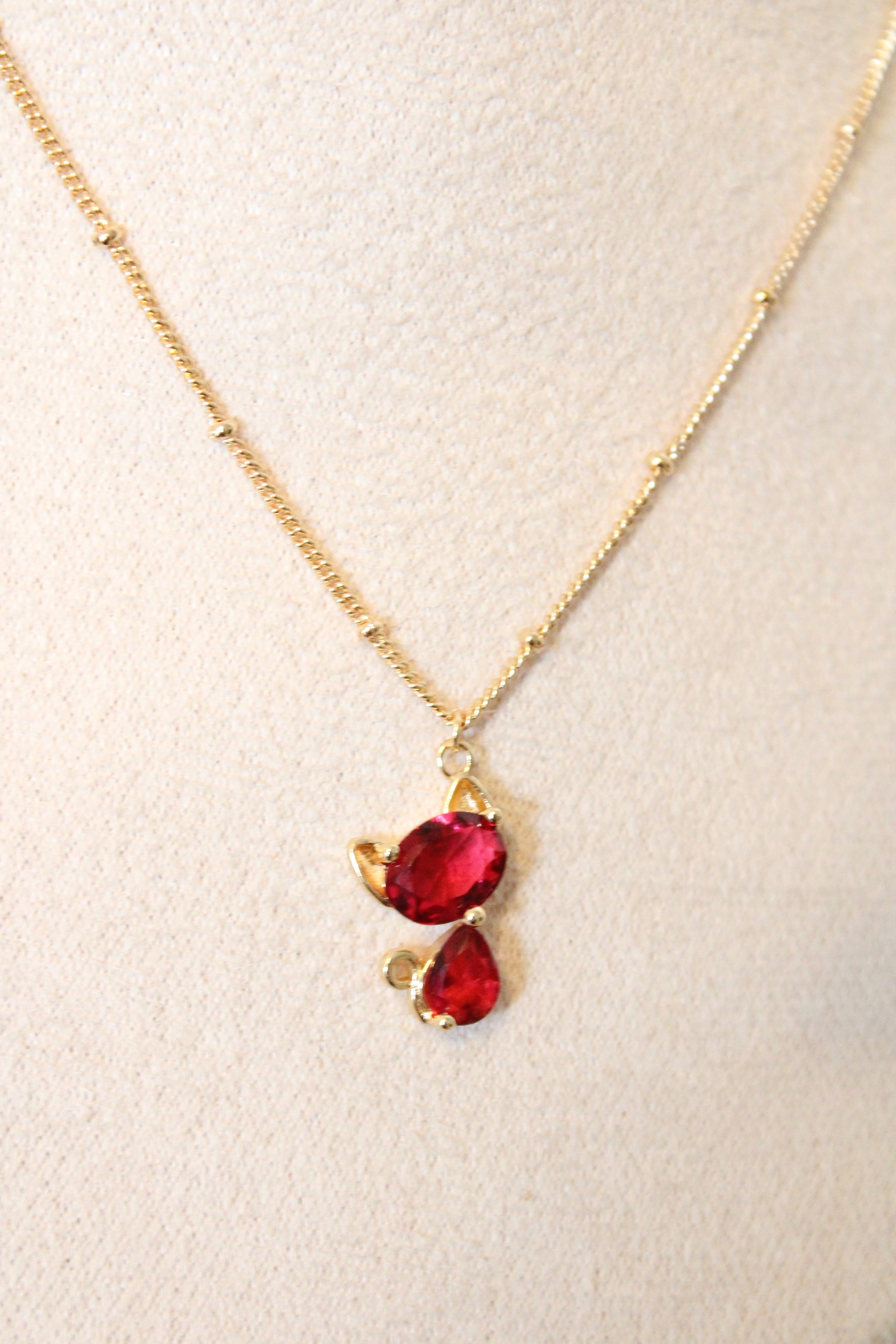 Collier avec pendentif en zircon rouge en forme de chat.
